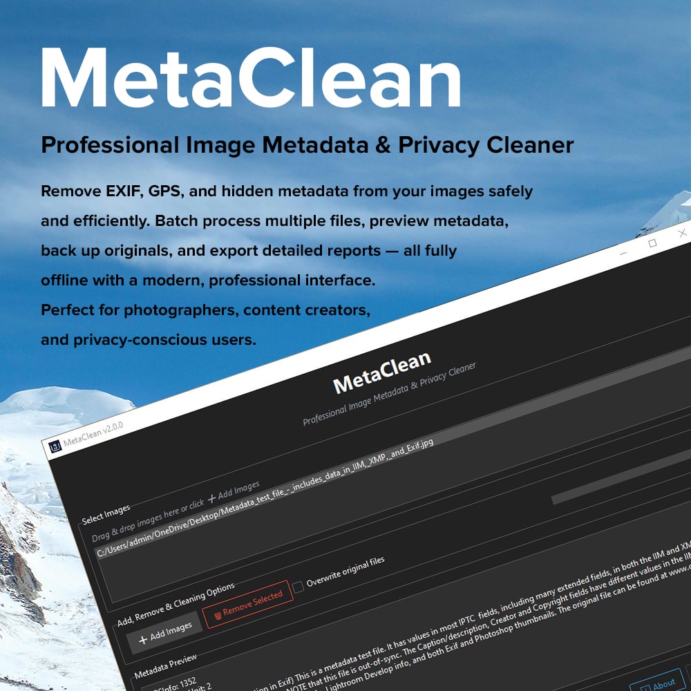 MetaClean v2.0.0 is a professional offline image metadata and privacy cleaning tool built for photographers, social media users, designers, developers, privacy-conscious individuals, and power users who need fast, accurate, and safe EXIF removal from images.